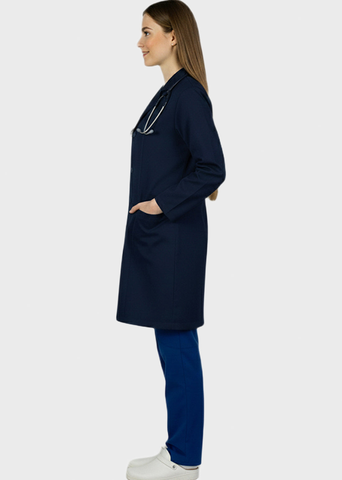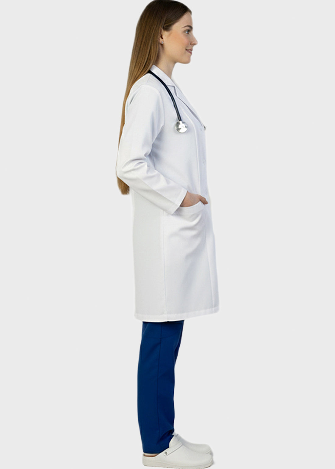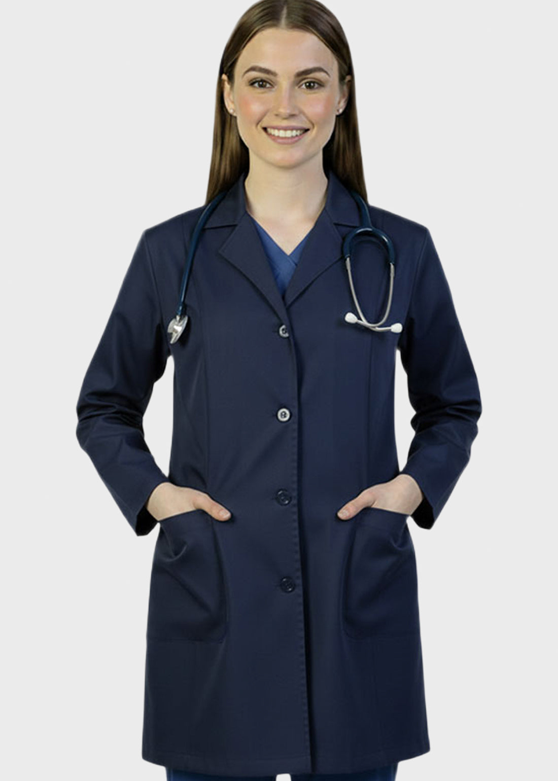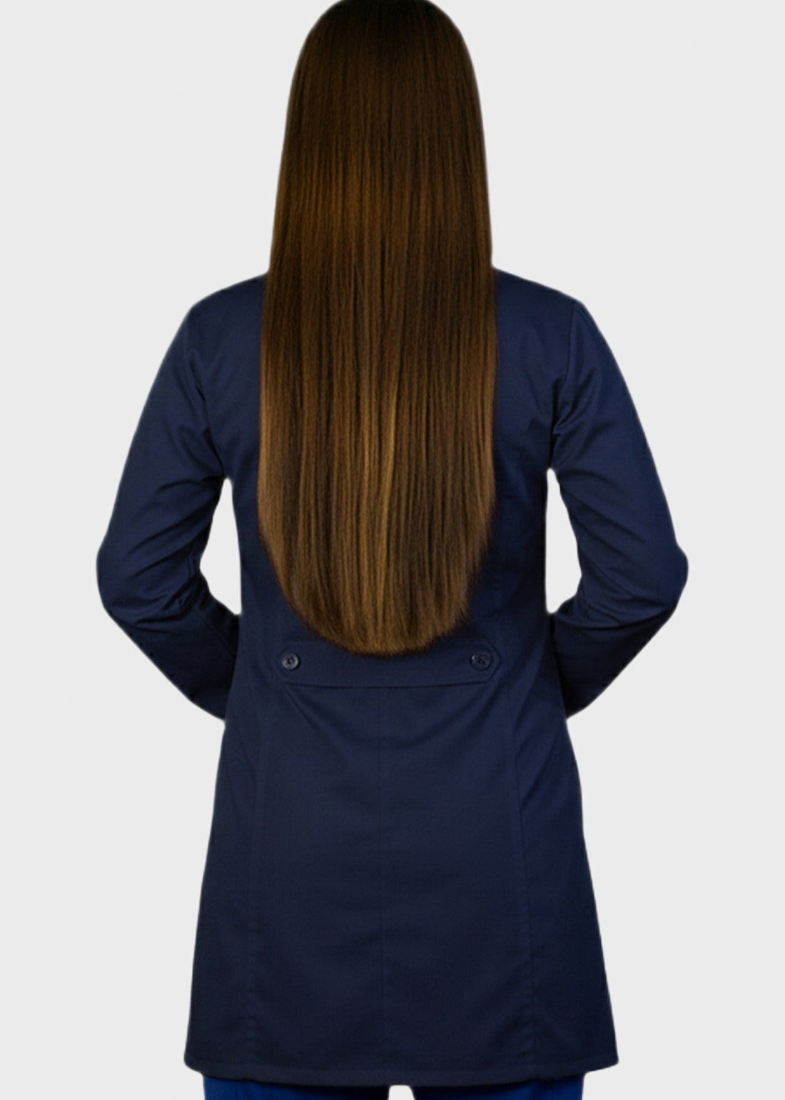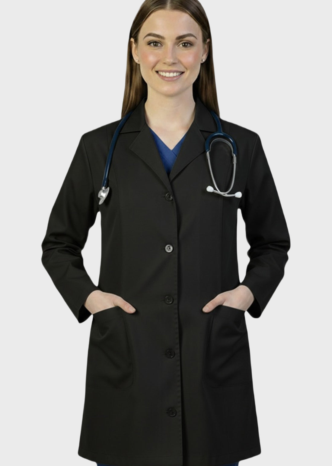 HeedFit 35 Inches Women's Two Pocket Fashion Lab Coat combines professional authority with a tailored, feminine fit. Featuring princess seams, notched lapel, five-button closure, back belt, and mock cuffs, it offers style, comfort, and mobility. Two spacious patch pockets provide secure storage, ensuring all-day performance and polished professionalism.