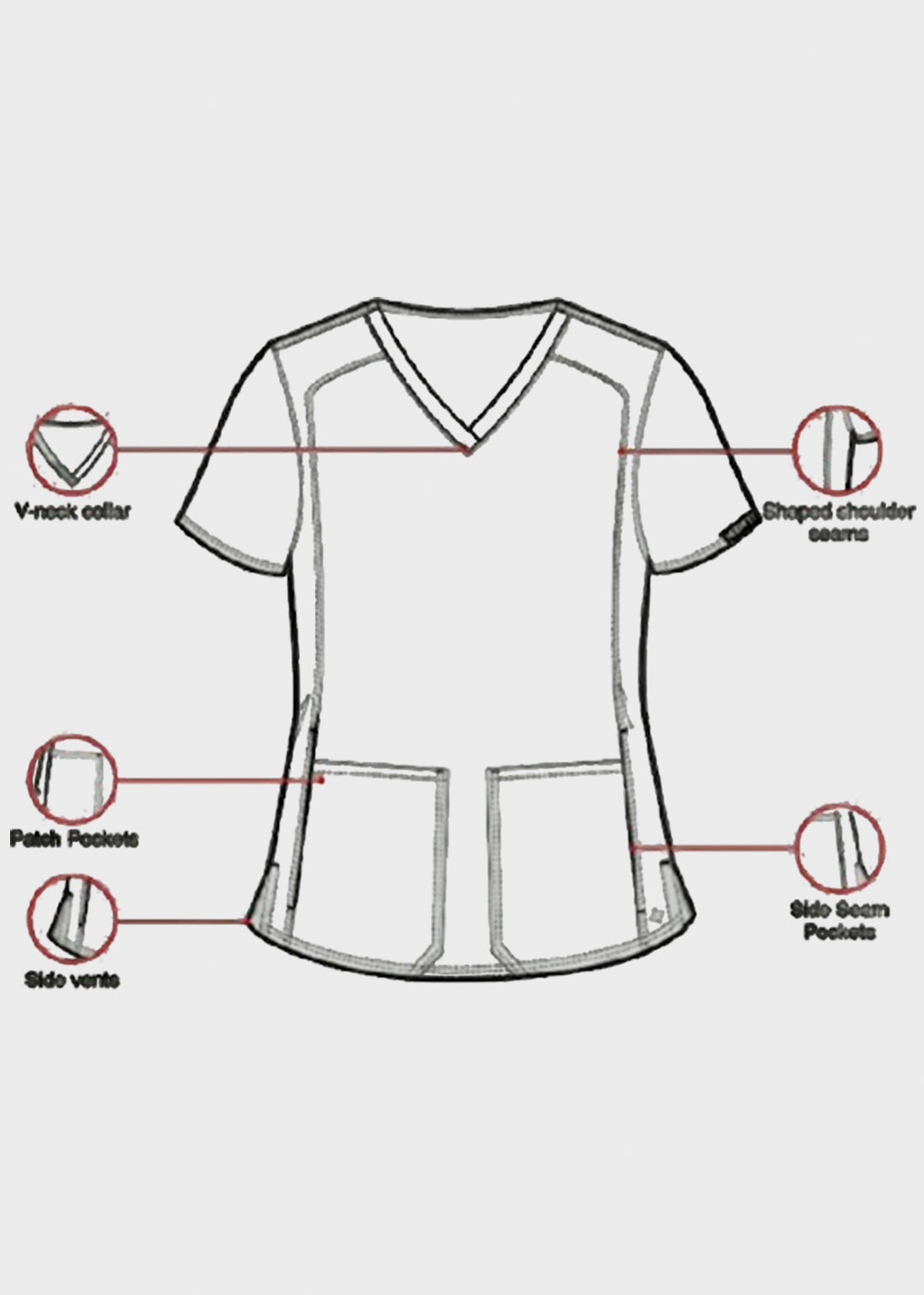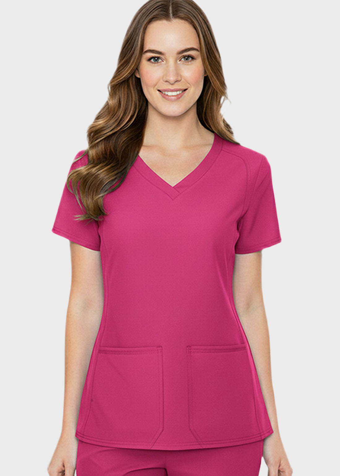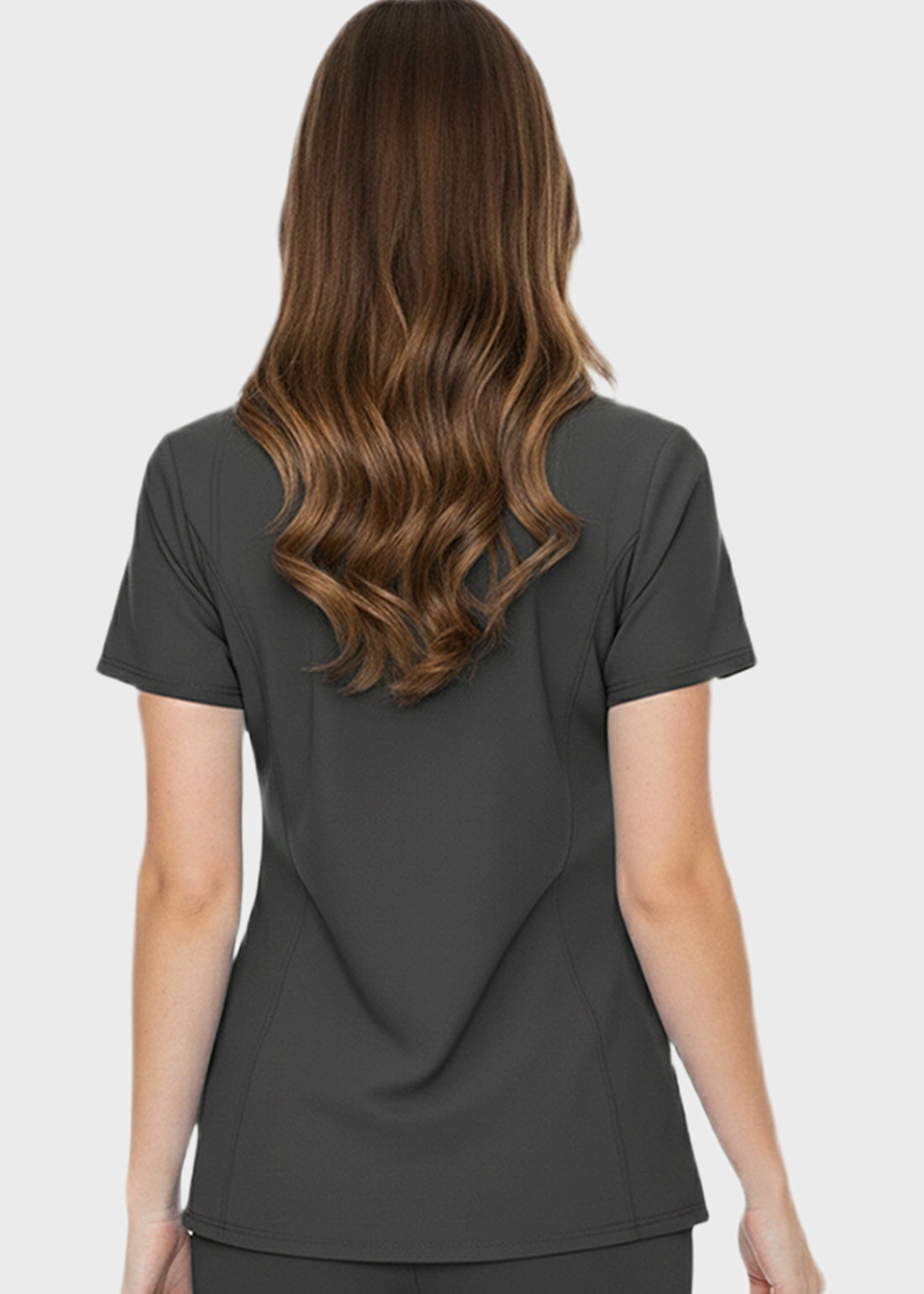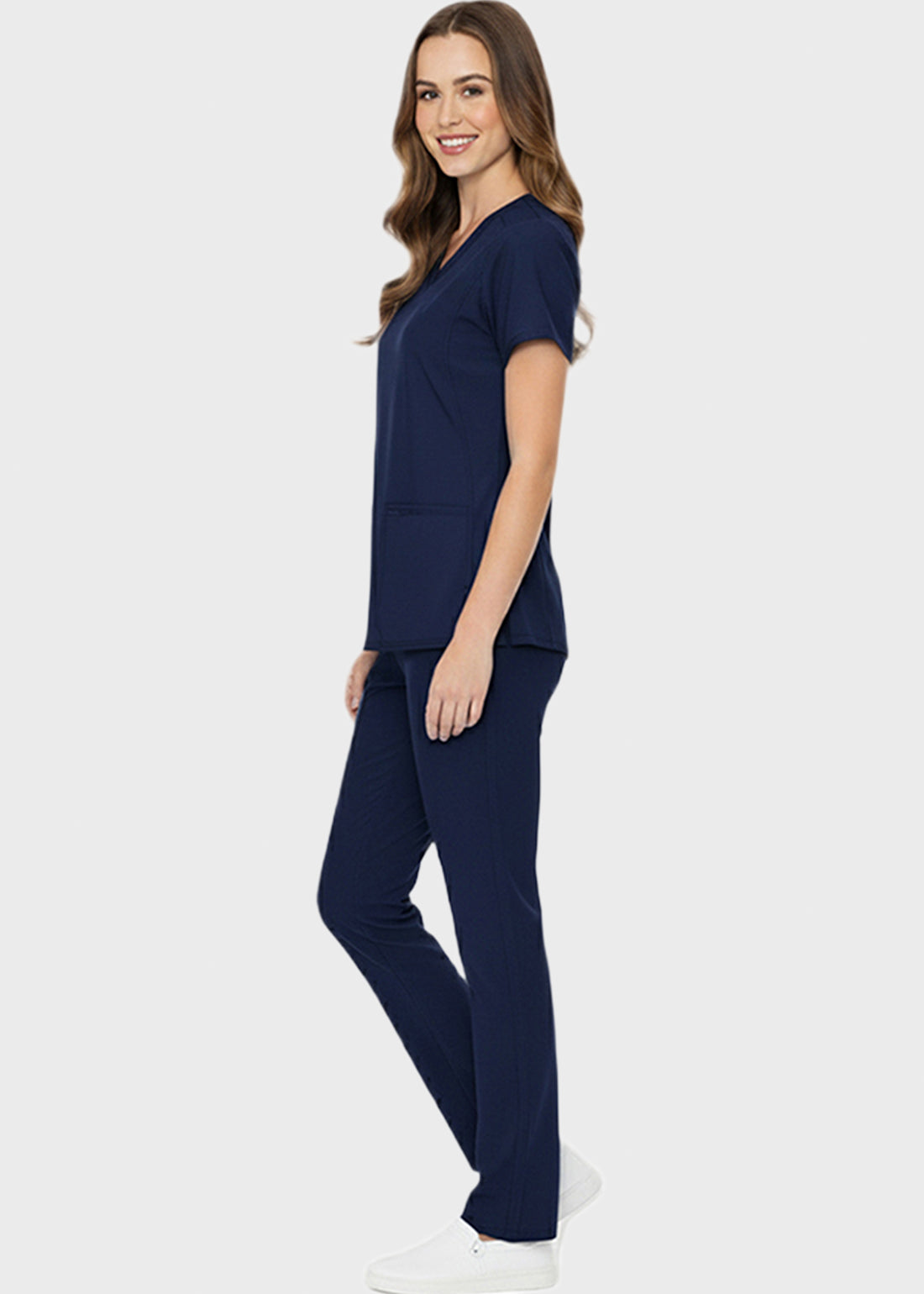 HeedFit Shaped Shoulder Seam Women's V-Neck Scrub Top combines modern style with high-performance utility. Made from a soft, durable fabric blend, it features shaped shoulder and angled yoke seams, side vents for mobility, and four pockets—two front patch and two side—for organized storage, comfort, and professional everyday wear.